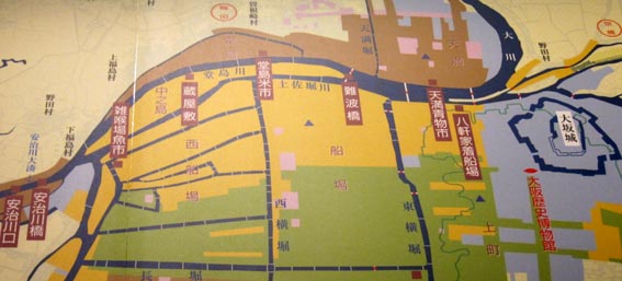 7~8世紀頃この辺りに難波津があり、遣隋使・遣唐使がここから旅立ちました。 明治以降 に交通手段が陸上へと移るまで、この辺りは水上交通のターミナルとして賑わいました。十返舎一九の「東海道中膝栗毛」 や司馬遼太郎の「竜馬がゆく」、浪花節「森の石松三十石船」にも八軒家がでてきます。」