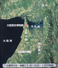 2![]() 1. 古墳時代中~後期頃の難波 (なにわ) の地形図。難波は上町 (うえまち) 台地の北部に位置する。河内湖は奥行きの深い内浦であり、 大阪湾とは狭い水路で結ばれていた。淀川は河内湖と大阪湾の双方に流れ込んでいた。縄文・弥生時代での河内湖の面積はもっと広かった。 [拡大画像: x26238.jpg:年代別の難波周辺地形図] [拡大画像: x26239.jpg]