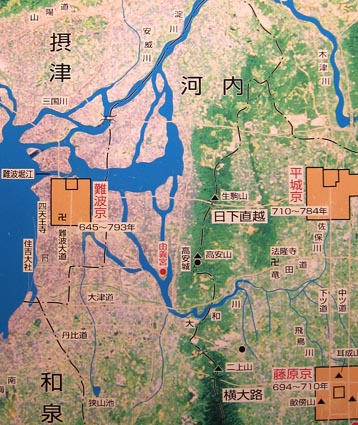 難波京の北側に内浦と大阪湾とを結ぶ水路・難波堀江が見える。堀江は古墳時代中頃 (5世紀) に開削されたとされる。