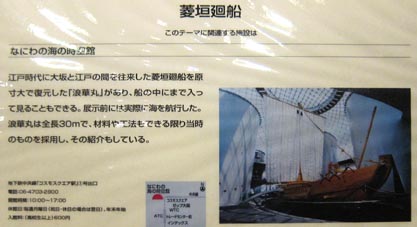 1![]() 1. 江戸時代に大坂と江戸との間を往来した菱垣廻船。その原寸大復元船である「浪華丸」の説明パネル。その復元船は かつて「なにわの海の時空館」(大阪海洋博物館) に展示されていた。 [拡大画像: x26242.jpg]