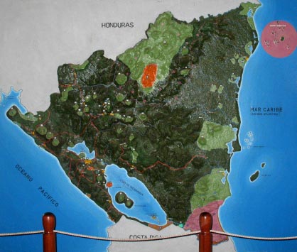地図Aは、ニカラグア首都マナグア近郊のマサヤ火山国立公園ビジターセンターで展示されている、ニカラグア南部域の立体的地形図である