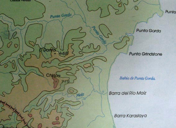 (青色の線)がプンタ・ゴルダ川である。西方へ向かい、二股に分岐する支流の上方側*をたどり、相対的に海抜が低い