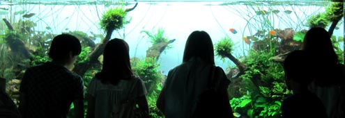 「水のきらめき ~自然水景~ 」という水中庭園の世界。そこには、2つの水槽「草原と石景」、「原生林の構図」がある。