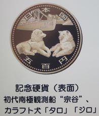 4 5 6![]() 4. 同上、記念硬貨、南極地域観測50周年記念500円ニッケル黄銅貨幣の表面に施された、宗谷とタロジロ。 [拡大画像: x26307.jpg] 5. 船内でのカラフト犬の飼育、展示、複製。「カラフト犬のえさ(複製) カラフト犬のえさは1日1食の冷凍肉と身欠きニシン。 越冬中は、非常食のペミカンが犬用のえさにもなった」。ペミカンとは、簡単に言えば調理した肉や野菜などを脂で固めた保存食のこと。 [拡大画像: x26309.jpg] 6. 説明書きによると、犬たちの寝起きした犬小屋は広さ16平方mで、暑さに弱いカラフト犬のためにクーラーが付けられていた。 [拡大画像: x26310.jpg] 2. 3 ![]() 3. [拡大画像: x26356.jpg] |