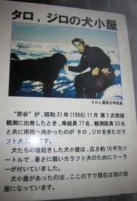 5月から、東京・「船の科学館」前に係留され永久保存されている。 1956年(昭和31年)11月8日、第1次南極観測隊(乗組員77名、観測隊員53名)が、カラフト犬(タロ、ジロを含む22頭)と共に、「宗谷」で 東京港晴海ふ頭から南極へ向け出港した。1957年1月24日、オングル島付近に接岸、翌25日から昭和基地建設開始。同月29日、オングル島に 公式上陸し、昭和基地と命名された。 そして、昭和基地にて1957年の冬季を越す第1次隊員として11名が抜擢された。犬係に任命されたのは菊池徹と北村泰一であった。 越冬するカラフト犬は22頭のうち最終的には19頭となり、その越冬の際に犬ぞりなどに使役された。越冬期間中に2頭が病死、 1頭が行方不明となっていた。 翌年の1958年(昭和33年)2月、先の第1次越冬隊員と入れ替わる予定の第2次越冬隊員を乗せて、宗谷が南極付近に到着した。 しかし、悪天候のため宗谷は昭和基地に接岸できなかった。第1次越冬隊員すら基地から小型雪上車でかろうじて宗谷へ帰還した。 越冬した10数頭(15頭とされる)の犬は基地付近に繋がれたまま残された。犬の救出もさることながら、「宗谷」自身の遭難の 危険もあったため、第2次越冬隊の基地への派遣が断念され、また犬の救出そのものも見送られた。繋がれたままでの極寒の環境下での 犬の生存は絶望的であった。 その後第3次越冬隊が派遣され、1959年(昭和34年)1月同越冬隊のヘリコプターが基地の上空にさしかかったところ、基地に2頭の犬が 生存していることが上空より確認された。その後、第1次越冬隊において犬係であった北村が「宗谷」から派遣され、 2頭はタロとジロであることが確認された。 基地では7頭が首輪につながれたまま死亡、他の6頭は消息不明であった。 タロとジロが生きていたことは日本中に感動と衝撃をもたらした。タロは第4次越冬隊と共に、1961年5月に4年半ぶりに帰国した。 1961~1970年まで札幌の北海道大学植物園で飼育され、1970年(昭和45年)8月老衰のため没した。 ジロは第4次越冬期間中の1960年(昭和35年)7月に昭和基地で病死した。両犬は剥製にされ、タロは同植物園にて、またジロは 国立科学博物館にて展示されている。