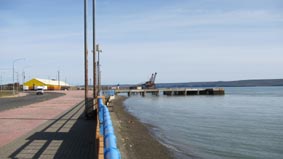 すぐ右手の路肩方向へ押し流されて行かないようにせねばならなかった*。 5日目の夜遅くようやくリオ・ガジェーゴスにたどり着いた。夜のとばりがすっかり下りていたが、土地勘をえる目的もあって、 先ず港のある地区へと直行した。地図によると市街地は奥行きの深い入り江沿いに広がっていた。入り江に臨む海岸通りに出るやいなや、 たくさんの照明灯にこうこうと照らされた大型機械装置が何やら激しい音を発しながらが稼働していた。暗く閑静な住宅街からの突然の 出現であったので、その光景は印象深く脳裏に焼き付くことになった。⌋ 2014年3月、パタゴニアのその地を29年振りに訪れた。今回は、アルゼンチン最南端の観光と漁業の町ウシュアイア (ティエラ・ デル・フエゴ島) から長距離路線バスでチリ領に入り、マゼラン海峡をフェリーで横切り、再びアルゼンチン領に入り、 17時間ほどかかってリオ・ガジェーゴスにたどりついた。 (その後、更に2000km以上の道のりを路線バスを乗り継ぎ、道草を繰り返しつつ旅を続け、首都ブエノス・アイレスには1週間ほど 後にたどりついた。) 脳裏にわずかに残る29年前の夜の埠頭風景の記憶を確かめたいと思い、翌朝出掛けることにした。クロワッサン(メディア・ルナ) とコーヒーの軽い朝食を済ませた後すぐに港の海岸通りをめざして、投宿先の安ホテルからぶらぶらと歩き出した。 15分ほど歩くと潮の香りが漂い始めた。そして、すぐに入り江にぶつかり、視界が開けた。海岸通りをぶらついてまず目にしたもの、 それは画像に写る錆だらけの棄てられたタグボートであった。 その隣には、何かの積み出し施設であろう、それも錆だらけで海上に放置されていた。 海岸通りには石炭の陸上積み出し施設らしきもの、古ぼけた倉庫などがぽつんと残されていた。港湾埠頭の面影を忍ばせるものは それくらいであった。それらの施設を何度も眺めているうちに、29年前の夜、通りすがりに見たものは、これらの陸上・海上の 石炭積み出し施設であったに違いないと確信するにいたった。