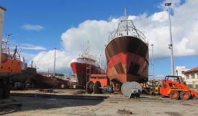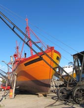 アルゼンチンのマル・デル・プラタは同国でも有数の商港であり漁港である。また、潜水艦基地を含む海軍基地のある港でもある。 漁港区の一角にあるドックヤードでは近海漁船が修理を待つ。 [2014.3.20-21 アルゼンチン/マル・デル・プラタにて][拡大画像: x26439.jpg] |