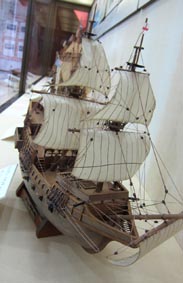 画像は英国人海賊キャプテン・ドレーク (女王エリザベスI世時代) の旗艦ゴールデン・ハインド号 (小型のガレオン船) の模型である。
