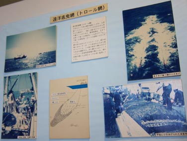 1. 「遠洋底曳網(トロール網)」と題するパネル展示。説明書きには以下のように記されている。