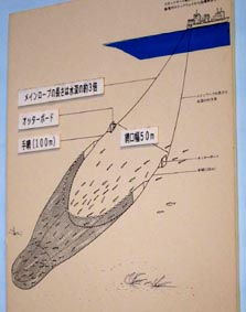 網の長さはおおよそ100メートル、網の両端にはオッターボードと呼ばれる大きな板がついている。この板の傾きで網口の広がり 具合を調節する。また網口にはネットゾンデという音波発信装置が備えられ、網の状態や網に入る魚の様子を常に監視している。」 [拡大画像: x26526.jpg][拡大画像: x26521.jpg: 説明書き「オッターボード(トロール網拡網板)」]