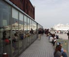 その優雅な客船美が「赤レンガ倉庫」のオープン・カフェ・テラスのガラスに美しく映える。(2004.5.29)