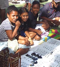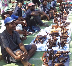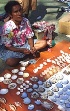 | いろいろな貝殻やその装飾細工、海の生き物の木彫りなどを売るパプアの人々。 モートモレスビーの港地区のフリーマーケットにて。 |