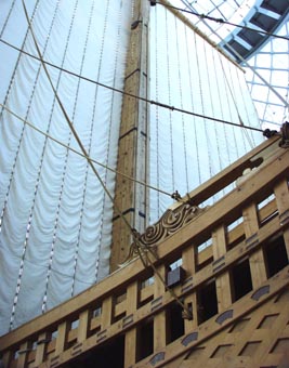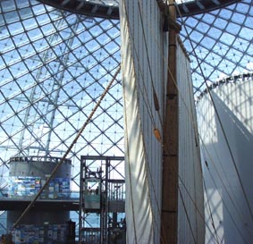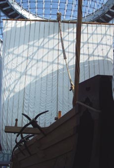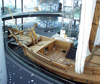 大阪海洋博物館 (なにわの海の時空館) は世界でもめずらしい海洋空間に建設された巨大パビリオンである。 巨大な海中構造物の上部にガラス張りのドームが突き出している。 展示館はいわば海に浮かぶ巨大なガラス張りドームに見える。 その最大の展示といえば復元された大型の菱垣廻船「浪華丸」。 主に江戸時代に活躍したこの菱垣廻船の歴史が詳細に紹介されている。 → [菱垣廻船「浪華丸」(その 2) ] [2003.11の風景][拡大画像(x10642.jpg)] |