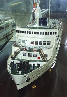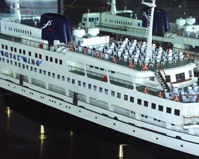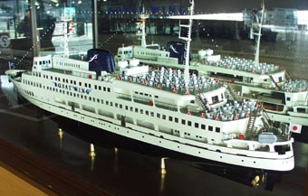 横浜港の港めぐりの遊覧観光船「ロイヤル・ウィング」。 横浜ベイブリッジ、本牧埠頭、みなとみらいなどの沖合いを周遊する。 横浜大桟橋の国際旅客ターミナルを発着場にしている。 その乗船場に「ロイヤル・ウィング」の模型が展示されている。 主要目: 2,872総屯数、全長86.7m、全幅13.5m、最大速力16.4ノット、定員640名である。 [2004.3の風景][拡大画像(x10708.jpg)][拡大画像(x10709.jpg)][拡大画像(x10710.jpg)][拡大画像(x10711.jpg)][拡大画像(x10712.jpg)] |