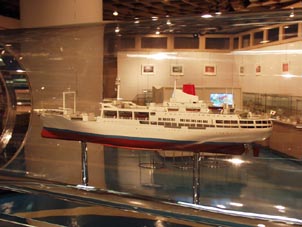 円筒形のガラスボックスに収められた「新さくら丸」シップモデル。巡航見本市船として活躍していたが、