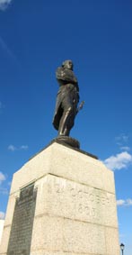 ナポレオン戦争における最大規模の海戦であった。歴史は少し遡り、1789年フランス・パリで革命が起こった。即ちパリの民衆によるバスチーユ牢獄の襲撃である。 その後フランス・ルイ16世の絶対王朝が崩壊した。他の欧州諸国は、その革命の波及を恐れ、フランスに干渉し戦った。そして、 時は1800年代初め、フランスにおいてボナパルト・ナポレオンが実権を握る時代となった。 トラファルガーの海戦がなされた1805年当時、欧州大陸はフランスの皇帝ボナパルト・ナポレオンの勢力・支配下に置かれていたが、 海上の支配権については英国下にあった。 英国は海上封鎖を行いフランス軍による英国本土への侵攻を防御していた。ナポレオンは、当時その支配下においていたスペインと の間で連合艦隊を組織し、英国の海上封鎖を突破して、ブローニュの港に集結させた35万人のフランス軍を英国本土に上陸させるという 計画であった。英国はそれを阻止すべくホレーショ・ネルソン提督(Vice Admiral Horatio, Lord Nelson) が率いる艦隊を差し向け 対峙させた。 英国艦隊は、「ヴィクトリー号 Victory」を旗艦とする戦列艦27隻、フリゲート4隻。他方、フランス・スペイン連合艦隊はピエール ・ヴィルヌーヴ提督が率いる「ビューサントル号」を旗艦とする戦列艦33隻であった。ネルソン提督は、仏西連合艦隊の隊列を分断するために、 その隊列に2列縦隊で突っ込むという、いわゆる「ネルソン・タッチ」戦法を展開した。 激戦の結果、英国側の損害は、艦船の大破・拿捕0隻、死者449名、戦傷者1,214名。他方、連合艦隊側のそれは、死者4,480名、戦傷者2,250名、 捕虜7,000名、艦船の大破・拿捕22隻。ヴィルヌーヴ提督自身も捕虜となった。他方、ネルソン提督自身はフランス狙撃兵の銃弾を受け、 その生涯を閉じた。「神に感謝する。私は義務を果たした」と言い残して息を引き取ったという。 トラファルガーの海戦によってナポレオン戦争が終焉を見た訳ではない。その海戦の2か月後 (1805年12月)、フランスはアウステルリッツの 戦いに勝利し、戦争の主導権を奪還した。その約10年後の1815年のワーテルローの戦いでナポレオンは敗北した。ナポレオン戦争の終結は、 そのワーテルローの戦いまで待たねばならなかった。トラファルガーの海戦によってフランス海軍は弱体化し、英国に対する経済封鎖を 貫徹できなかったことが、フランス敗北の重要な要因の一つへと繋がっていくのである。 ナポレオン戦争後のヨーロッパに新たな秩序が形成されたが、それをウィーン体制と称される。 [2013.5.23 英国ポーツマス市内のオールド・ポーツマス地区のブロード・ストリート沿いにある広場にて] [拡大画像: x25269.jpg][拡大画像: x25551.jpg][拡大画像: x25270.jpg: 銅像銘板] ナポレオン戦争略史(ボナパルト・ナポレオンの生誕から没落まで /トラファルガーの海戦の位置づけのための略史) |