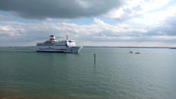 が広がる。対岸にうっすらと見える低い陸地はワイト島 (Isle of Wight)。ポーツマス市内のオールド・ポーツマス地区には古い港町の