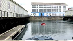 1 2![]() 3 ![]() 1. 2つある閘門 (ロックゲート/lock gates) のうちの海側にあるゲート。木製の観音扉を開閉するための油圧装置が見える。 油圧装置が意外と小さいものであることに驚かされる。下げ潮で外海はかなり潮位が低い。 [拡大画像: x25712.jpg] 2. 泊渠側にある閘門。観音扉の左側の区画が閘室で、右側が泊渠に通じる水路である。 [拡大画像: x25713.jpg] 3. 中央右端にトンネル入り口のようなものが見えるが、それがボートハウス内を貫通して外海へ通じる水路の入り口である。 泊渠の水位はいつも一定に保たれ、「ミニポート (MiniPort)」という子供の遊び用プールにもなっている。 [拡大画像: x25711.jpg] |
