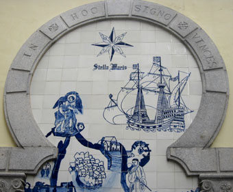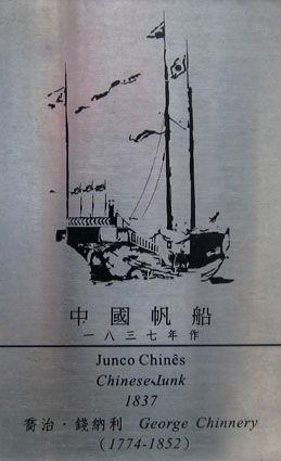 建立された大聖堂の跡である。天主堂跡のすぐ東側の丘にはモンテの砦(Fortaleza de Monte)がある(丘にはマカオ博物館がある)。 天主堂前に広がる緩やかな階段を下り、路地を道なりに進みゆくけば、大堂 (主教座堂 Igreja da Sé/Catedralカテドラル) へ とつながる。 路地の両側には土産物店やレストランなどがくっつき合って軒を並べる。大堂前地(大堂広場 Largo da Sé)を取り囲む狭い路地の 一つにポルトガル語で「Travessa do Meio」という路地(短い路地という意味であろうか)がある。 その路地への入り口には小さな水飲み場があって、壁面上部にはアズレージョ(ポルトガル様式の彩色タイル)が飾られている。 路地へと分け入ると、壁面にはさらにいくつかのアズレージョが飾られている。 画像はそのうちの一つで、中国のジャンク船のアズレージョである。 銘板には「中国帆船 Junco Chinês Chinese Junk 1837」、1837年George Chinnery (1774-1852)作と記されている。