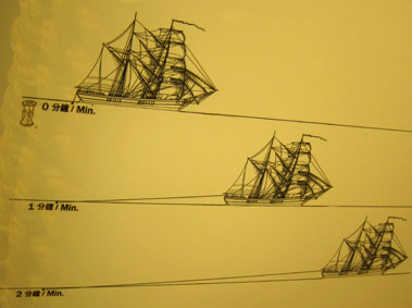[英語] chip log: n.[海][速力を計る]手用測程儀; 扇形板(=log chip). [ポルトガル語]ampulheta: s.f.砂時計(instrumento designado a medir o tempo, a bordo dos navios [船上にて時間を測定する ための用具]. 画像1. ハンドログと砂時計をもって船脚を測定している船乗りたち(図絵)。 [拡大画像: x27075.jpg] [拡大画像: x27076.jpg][拡大画像: x27077.jpg: 説明書き/ポルトガル語&英語 Barca ou Barquinha, Hand Log] 画像2. ハンドログと砂時計の実物。 [拡大画像: x27079.jpg][拡大画像: x27080.jpg][拡大画像: x27081.jpg: 説明書き/ 砂時計 Ampulheta, Sand Glass] [画像撮影 2015.11.21 マカオ海事博物館にて] |