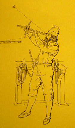 画像は、太陽・星などの天体の高度を測定し、おおよその緯度の計算を可能にしたクロス・スタッフ(Cross Staff)