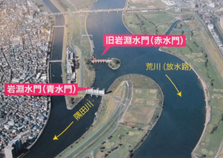 ・ 画像(上段)は、国道122号線にかかる荒川大橋 (川口-赤羽間) から下流方向を観たもので、赤水門と青水門 (Old and New Iwabuchi