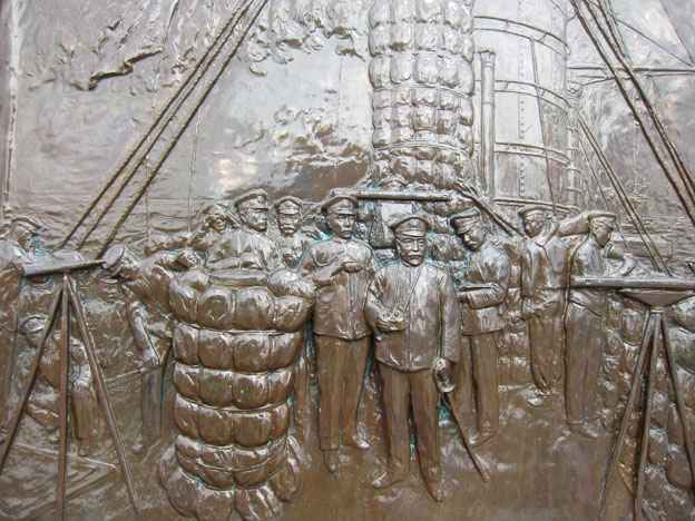 画像1は東城鉦太郎氏によって描かれた図絵「三笠艦橋の図」である。画像2はそのレリーフである。 三笠艦橋図中の人物: 中央に司令長官大将東郷平八郎、そのすぐ左は参謀長少将加藤友三郎、砲術長少佐 安保清種、艦長大佐伊地知彦次郎、東郷のすぐ右は参謀中佐秋山真之などである。 [画像撮影 2016.6.15. 記念艦三笠の艦上にて][拡大画像: x27217.jpg][拡大画像: x27256.jpg][拡大画像: x27218.jpg: 図中の人物] [拡大画像: x27219.jpg: 図中人物] |