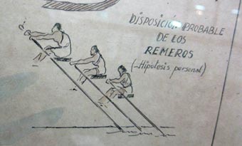 1 2![]() 1&2: 作者の個人的仮説として、3漕手たちの配置想像図を描いている。オールの漕手側の先端には釣り合い重りが取り付けられている。 [スペイン語] contrapeso: n.m.釣り合い重り、平衡錘(すい); 反対に働く、力釣り合せる力/tolete: n.m.[海][オール受け用の]トールピン、 オール受け.