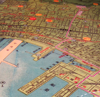 昭和の初め頃の神戸港周辺地図。白い破線の円は移民船出航場所(左から第1、2、3、4突堤)を示す。戦前、戦後に約40万人の移民が