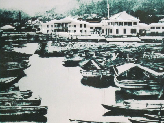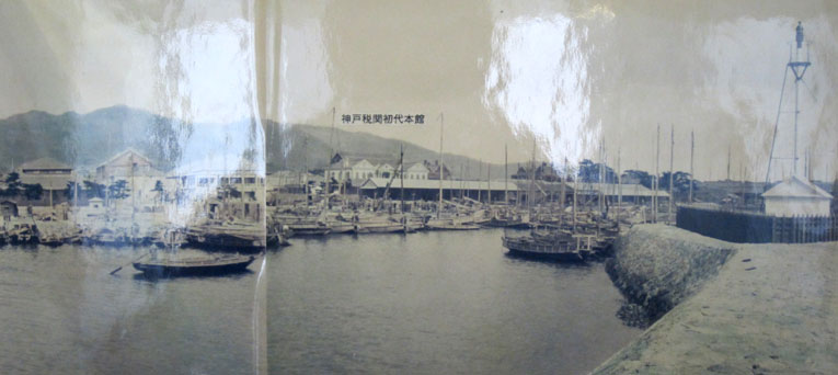 1![]() 1. キャプションには、「海から居留地を望む「瀬戸内海写真帳」(明治初期)神戸市立博物館蔵」、と記される。 背後の山並みは六甲山。神戸税関初代本館前の地先水面は、はしけ溜りとなっている。出典: 神戸税関広報展示室 [拡大画像: x27294.jpg] |