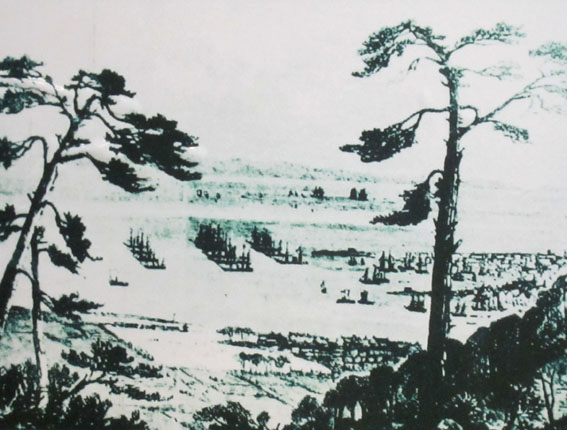 画像は神戸税関広報展示室に掲示される「開港当日海から眺めた兵庫 (神戸)」の港風景である。 キャプションには、「開港当日海から眺めた神戸港(イラストレイテッド・ロンドン・ニュース掲載) 中央に見える高灯籠は生田神社前の名高い灯籠で、沖を航行する帆かけ舟はこの灯籠が見え始めると、 帆をおろして生田神社に航海の安全を祈願したという。神戸市立博物館提供」、と記されている。 兵庫港 (後に神戸港と改称される) は、和田岬が偏西風を遮蔽するため波が平穏であり、また水深も深く、船が安全に停泊できる 条件をもっていた。開港当時は、岸壁や桟橋などの港湾施設はまだほとんど造営されていなかった。 [画像撮影: 2015.10.14/出典: 神戸税関広報展示室 Customs Museum, Kobe][拡大画像: x27293.jpg] |