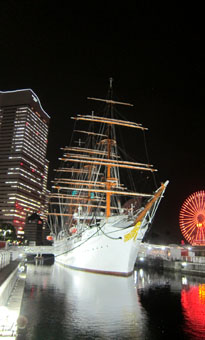 船着き場である「ぷかりさん橋 Pukarisanbashi Pier」がある)。 式典後、みなとみらい地区のクイーンズスクエアやランドマークタワーなどの高層ビル群の中を通り抜けながら、 JR桜木町駅へ向かった。陽が落ちてほとんど暗くなっていた。 ビル群の狭間から屋外ドックに係留されている帆船日本丸のマストなどがちらちらと目に入った。何度も観て写真も撮っているので 今回わざわざ立ち寄るつもりもなく通り過ぎた。 暫くして、最後にもう一度日本丸の方を再び振り向いて見ると、今度はライトアップされ優美な姿を見せる日本丸が目に飛び込んできた。 思い直してライトアップ姿を一度はじっくりと拝観してみようという気になり引き返した。思い起こせば夜にライトアップされ、 真っ白なロングドレスに身を包んだ姿を拝観するのは初めてのことであった。勿論、そんな日本丸を切り撮るのも初めてのことである。 夜の舞踏会に出で立つかのように着飾った貴婦人・日本丸もまた最高である。 [画像撮影: 2015.11.17/「帆船日本丸・横浜みなと博物館(Sail Training Ship NIPPON MARU & Yokohama Port Museum)」にて] [拡大画像: x27313.jpg] |