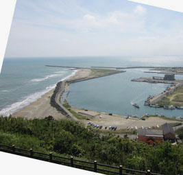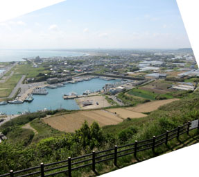 1 & 2. 飯岡刑部岬展望台から、眼下の飯岡漁港の遠い先に弓なり状にのびる九十九里浜を眺望する。 [拡大画像: x27176.jpg][拡大画像: x27177.jpg] |
