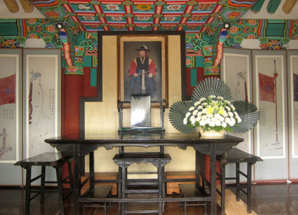 忠烈祠には同将軍の位牌がおさめるという。画像は忠烈祠内に掲げられた李舜臣の肖像画である。