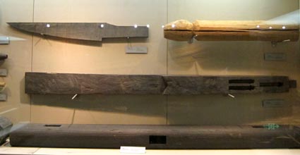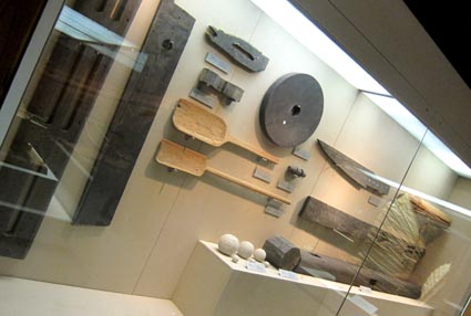 木櫂(wooden paddle)、円盤(round plate)、浮子(buoy)、石球(stone balls)などが陳列される。