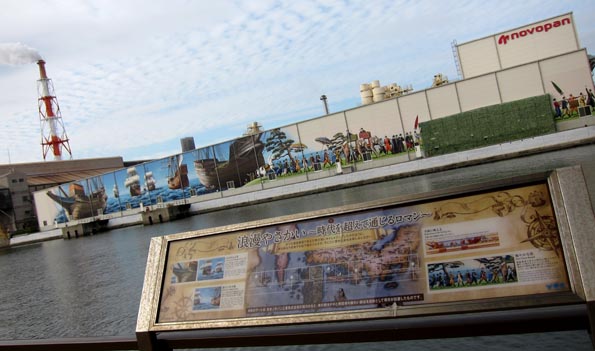 観光振興のために創ったという、近世の堺港における南蛮船や南蛮人らの賑わいを描写する壁画(横幅100mほど)