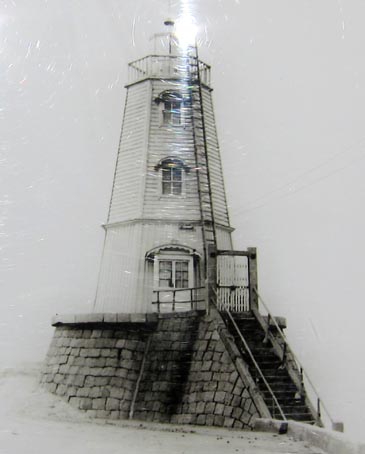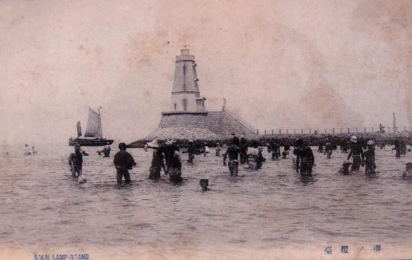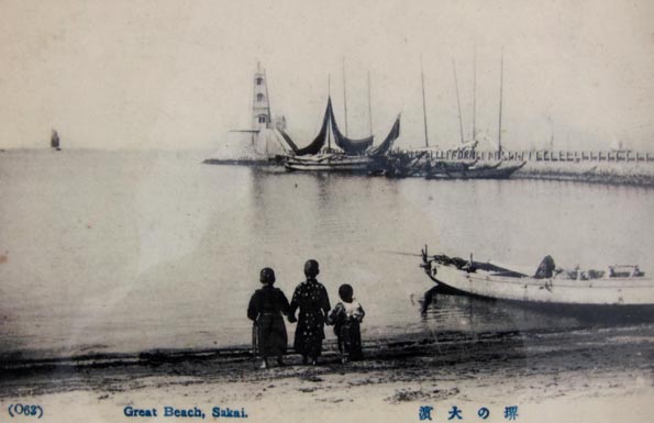 4![]() 4. 「戦前の大浜の様子/堺市立中央図書館蔵」/燈台前の史跡案内パネルより。子どもたちが燈台と船溜りを眺めている。 [拡大画像: x27973.jpg]