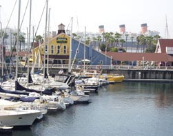 2![]() 2. 「Rainbow Harbor」のマリーナと「Shoreline Village」のレストラン。その向こう側に遠望するのは「Queen Mary号」。 [拡大画像: x27853.jpg] |