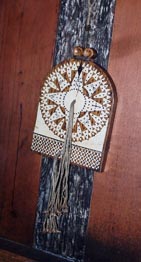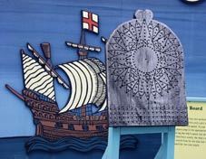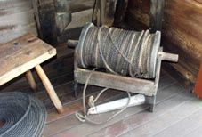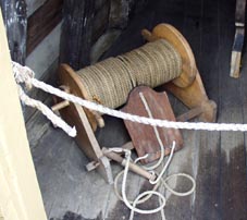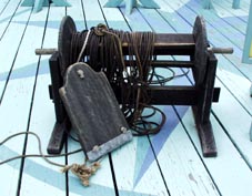 1 2![]() 1 & 2. チップ・ログ。説明パネルには次のように記される。 Chip-log: The chip-log measures the speed of the ship. It consists of a board weighted on one edge which is attached to a line with knots at regular intervals. To use it, the sailor tossed the board into ocean, and counted how many knots ran out in a short space of time, usually half a minute. By multiplying the length of line by the number of time units, he could figure out how fast the ship was traveling per hour.