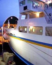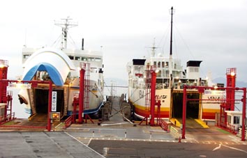 2. 「あさかぜ5号 Asakaze No.5」があんぐりと船首部を開けて大型貨物長距離トラックなどを次々と飲み込んで行く。 [拡大画像: x16838.jpg]