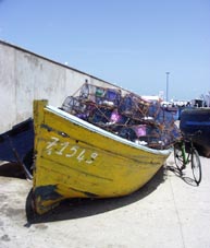 モロッコの海と船の風景。フィッシングボートにはフレームが太いワイヤーでできたトラップ篭が 山積みである。その中に餌をしこんでロブスター、カニなどの高額で取引できる甲殻類を捕獲するのであろうか。