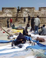 エッサウィラ漁港の風景 [19]/総員で網の繕い