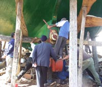 モロッコの海と船の風景。木造船のプロペラシャフトの軸孔部を調節してプロペラを据え付けようとしている造船工たち。