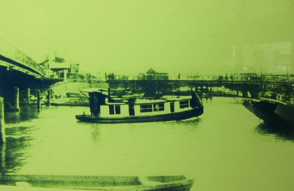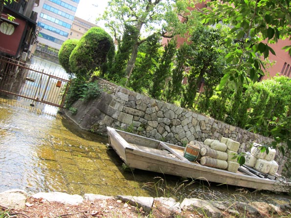 京都・高瀬川の舟入址、高瀬舟の舟曳風景 (古写真)