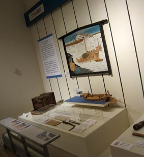 埼玉県立歴史と民俗博物館 (さいたま市大宮区) の「民俗展示室」での展示。 ・ テーマ: 埼玉県における水にまつわる民俗。 ・ 展示内容: 河川や湖沼・溜池などにおける漁業、水にまつわる行事や祭りごとの資料をはじめ、「海なし県」である埼玉県の人々の 水との関わり合いなどを紹介する。