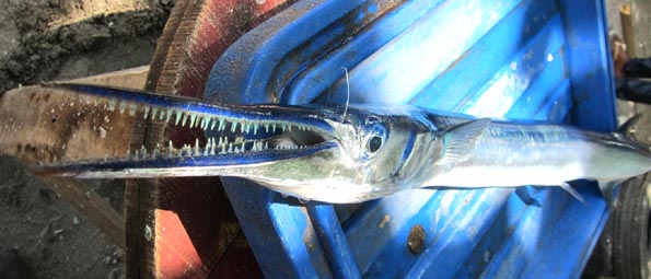 キャンパスのすぐ隣には、シリマン・ビーチ(Silliman Beach)という白砂の海岸が続く。 幾つもの小さな漁撈用アウトリガーの他、フィッシュ・トラップや原色で彩られたフロートを付けた 刺し網らしき漁網などが、椰子の木陰に浜揚げされている。 浜では早朝の漁を終えた漁師たちが仲間とのんびりと談笑したり、こまごまとした身の回りのことにいそしんでいるが、 獲物を取り引きする漁師に遭遇した。魚名を尋ねてみると、誇らしげに、即座に「スォードフィッシュ」だとという返事が返ってきた。 英語の「swordfish」ならばメカジキのことであるが、果たしてそうなのか、、、。 いずれにしても上下の顎に均等に鋭く生えた歯には驚かされる。