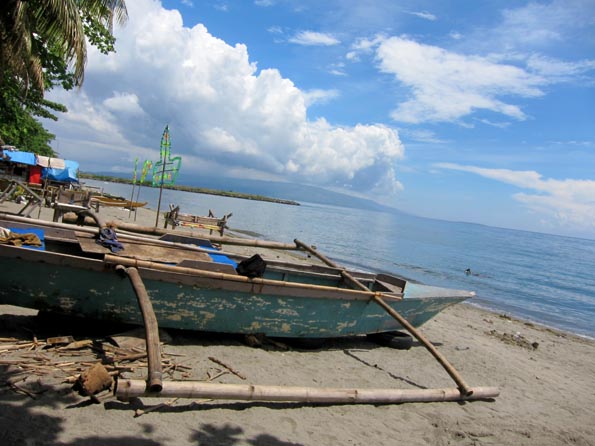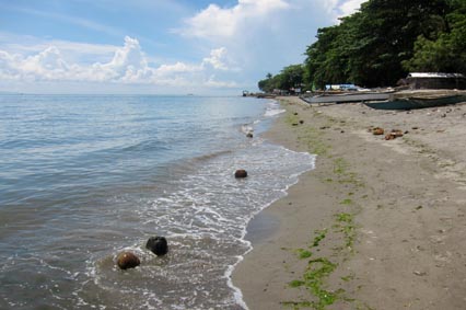 キャンパスのすぐ隣には、シリマン・ビーチ(Silliman Beach)という白砂の海岸が続く。浜でビーチコーミングをしながら 散策していたところ、画像 1 & 2 に写るスローガンに遭遇した(画像 2: セブ島を遠望する)。世界で最もシンプルにしてポピュラーで、また汎用性のあるスローガンといえば、まさにこの「I Love ・・・・」であろう。 浜にわざわざ目立つように大きく建てられている。世界オンリー・ワンのスローガンには違いなかろう。だが、 「 I ♥ 8.5.8. OGT 」はまるで暗号のようで、 「我、何を愛する」と訴えているのか。異邦人である私には肝心のところが理解できない。