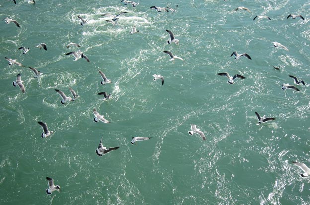 | 画像5&6: 満潮時に海水が発電用タービンへ流入し、発電を終えた海水が外海から人工湖に向かって勢いよく吐き出されて渦を巻いている (画像5)。小魚がまとまって吐き出され、それに寄りつくのであろうか、海鳥が舞う。 [拡大画像: x27966.jpg][拡大画像: x27967.jpg] |