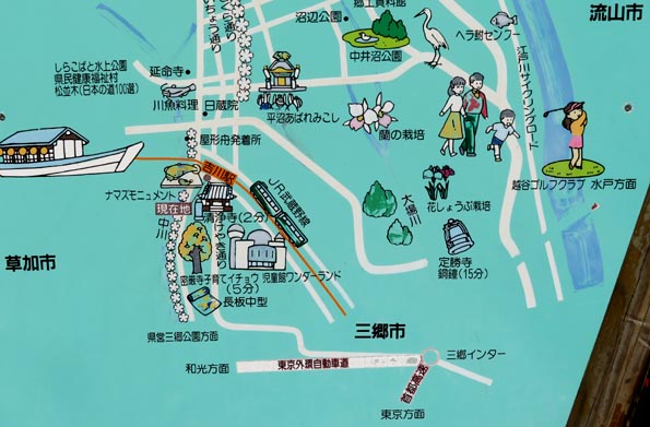 ![]() JR「吉川」駅は画像中央左寄り。その左に「ナマズモニュメント」、その下に「中川」が記されている。江戸川は画像右端に記される。 |
