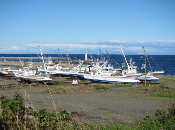 事情があって、陸(おか)に憩留されているのであろうか。草がなびく港内の原っぱに浜揚げされたままの7、8隻の漁船。